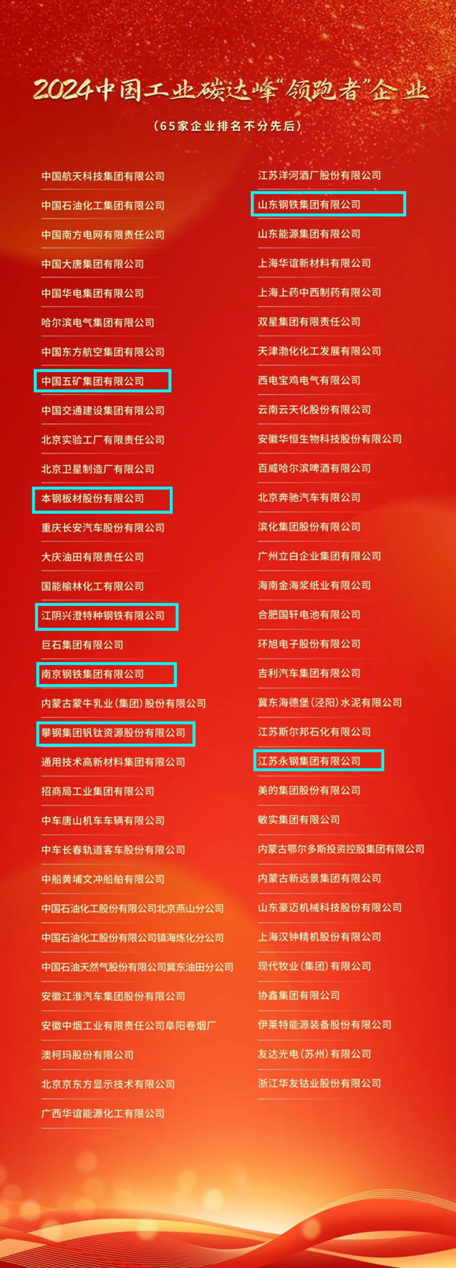 11月30日,中國工業經濟聯合會在第三屆中國工業碳達峰論壇上發布了2024中國工業碳達峰“領跑者”企業,共有65家堅守行業綠色低碳發展使命,勇擔工業綠色低碳轉型重任的優秀企業成為中國工業碳達峰“領跑者”企業,其中更包含山東鋼鐵、中國五礦、本鋼板材、興澄特鋼、南京鋼鐵、攀鋼釩鈦、永鋼集團(排名不分先後)等多個鋼鐵企業。