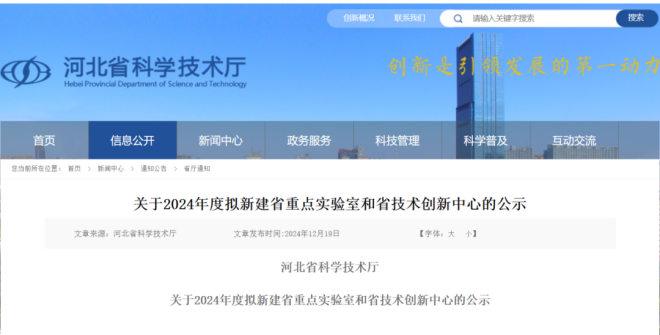 12月19日,河北省科學技術廳網站發布《關於2024年度擬新建省重點實驗室和省技術創新中心的公示》,共有48個2024年度擬新建省重點實驗室和135個2024年度擬新建省技術創新中心,公示期為2024年12月19日起至12月25日。