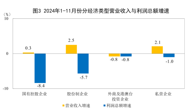 1—11月份,規模以上工業企業中,國有控股企業實現利潤總額20387.7億元,同比下降8.4%;股份製企業實現利潤總額50143.0億元,下降5.7%;外商及港澳台投資企業實現利潤總額16062.9億元,下降0.8%;私營企業實現利潤總額19649.1億元,下降1.0%。