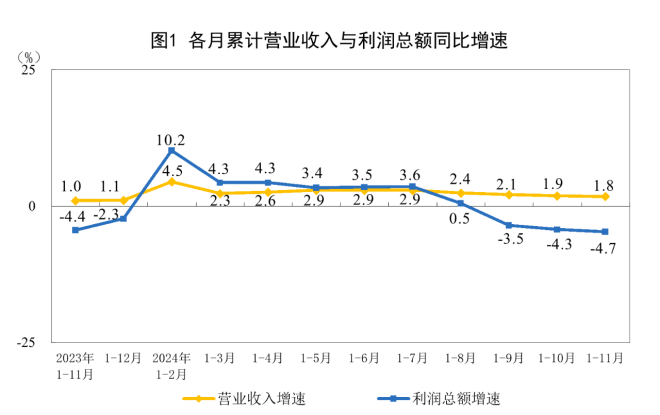 2024年1—11月份全國規模以上工業企業利潤下降4.7%,11月份降幅繼續收窄