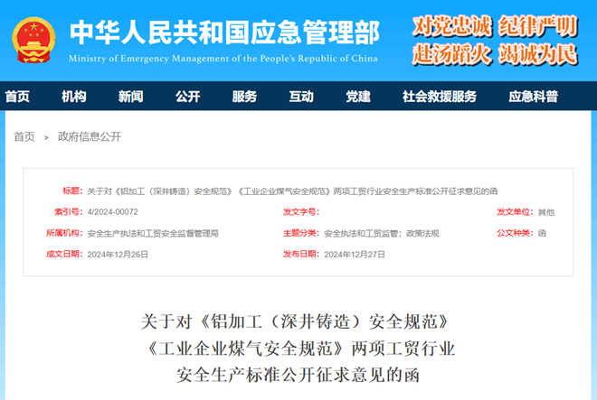 12月27日,應急管理部網站發布了關於對《鋁加工(深井鑄造)安全規範》《工業企業煤氣安全規範》兩項工貿行業安全生產標準公開征求意見的函。