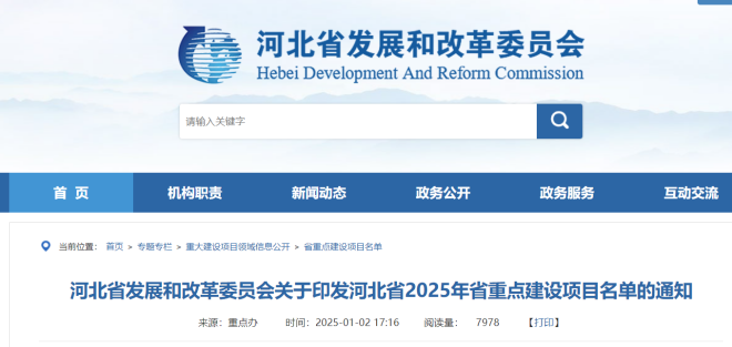1月2日,河北省發改委印發《河北省2025年省重點建設項目名單》,共計703個項目。其中,新開工項目349項,續建項目259項,建成投產項目95項,涵蓋戰略性新興產業、傳統產業升級改造、農業產業化、現代服務業、基礎設施和社會事業等領域。