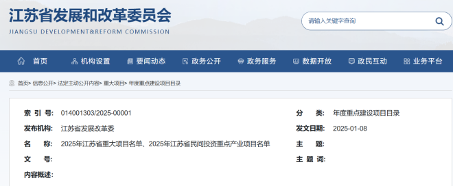 1月8日,《2025年江蘇省重大項目名單》正式印發實施,其中實施項目500個,比去年多50個,計劃總投資多118億元;儲備項目100個。