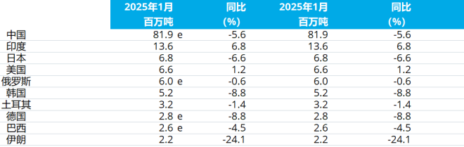2025年1月全球69個納入世界鋼鐵協會統計國家/地區的粗鋼產量為1.514億噸,同比下降4.4%。