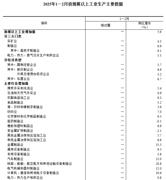 分行業看,1-2月份,41個大類行業中有36個行業增加值保持同比增長。其中,煤炭開采和洗選業增長5.4%,石油和天然氣開采業增長0.9%,農副食品加工業增長8.3%,酒、飲料和精製茶製造業增長3.9%,紡織業增長7.0%,化學原料和化學製品製造業增長9.5%,非金屬礦物製品業下降2.1%,黑色金屬冶煉和壓延加工業增長5.7%,有色金屬冶煉和壓延加工業增長6.6%,通用設備製造業增長9.5%,專用設備製造業增長3.8%,汽車製造業增長12.0%,鐵路、船舶、航空航天和其他運輸設備製造業增長20.8%,電氣機械和器材製造業增長12.0%,計算機、通信和其他電子設備製造業增長10.6%,電力、熱力生產和供應業增長0.8%。