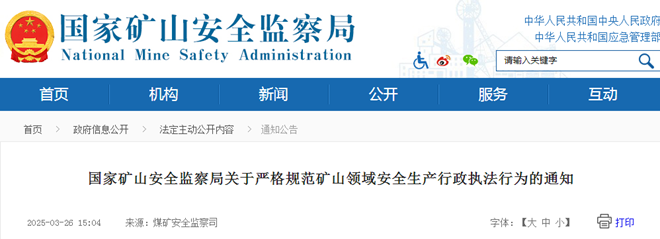 3月26日,為解決部分地區檢查頻次高、隨意性大,隱患排查跑礦次、質(zhi)量(liang)差(cha),企(qi)業(ye)主(zhu)體(ti)責(ze)任(ren)落(luo)實(shi)不(bu)到(dao)位(wei)等(deng)問(wen)題(ti),全(quan)力(li)防(fang)範(fan)礦(kuang)山(shan)重(zhong)特(te)大(da)事(shi)故(gu)發(fa)生(sheng),國(guo)家(jia)礦(kuang)山(shan)安(an)全(quan)監(jian)察(cha)局(ju)發(fa)布(bu)了(le)關(guan)於(yu)嚴(yan)格(ge)規(gui)範(fan)礦(kuang)山(shan)領(ling)域(yu)安(an)全(quan)生(sheng)產(chan)行(xing)政(zheng)執(zhi)法(fa)行(xing)為(wei)的(de)通(tong)知(zhi)。