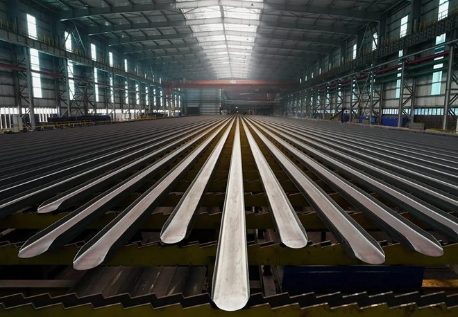 圖為唐山市海港經濟開發區一家鋼鐵企業剛軋製出爐的槽型鋼