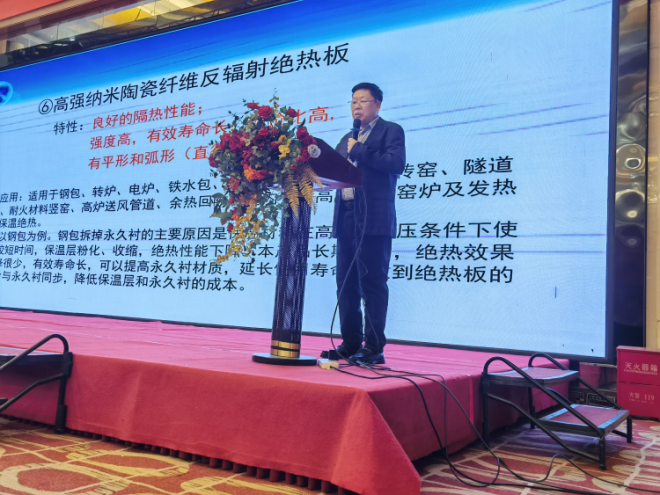營口創興科技有限公司董事長楊恩良介紹《營口創興科技研製生產的高強納米絕熱板在冶金、耐材窯爐的應用》,分享創新產品應用實踐。