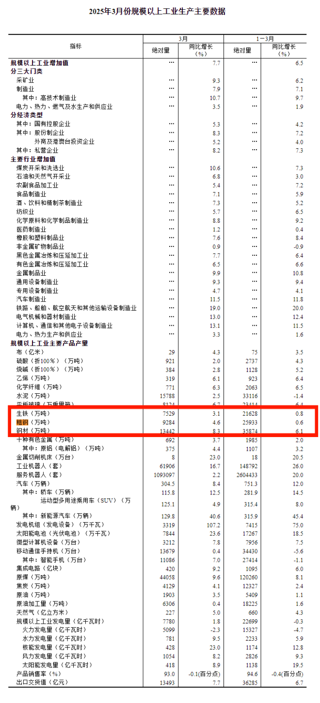 4月16日,國家統計局公布的數據顯示,1-3月份,我國生鐵產量21628萬噸,同比增長0.8%;我國粗鋼產量25933萬噸,同比增長0.6%;我國鋼材產量35874萬噸,同比增長6.1%。