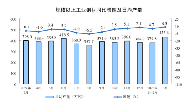 2025年1-3月份我國粗鋼產量25933萬噸,同比增長0.6%