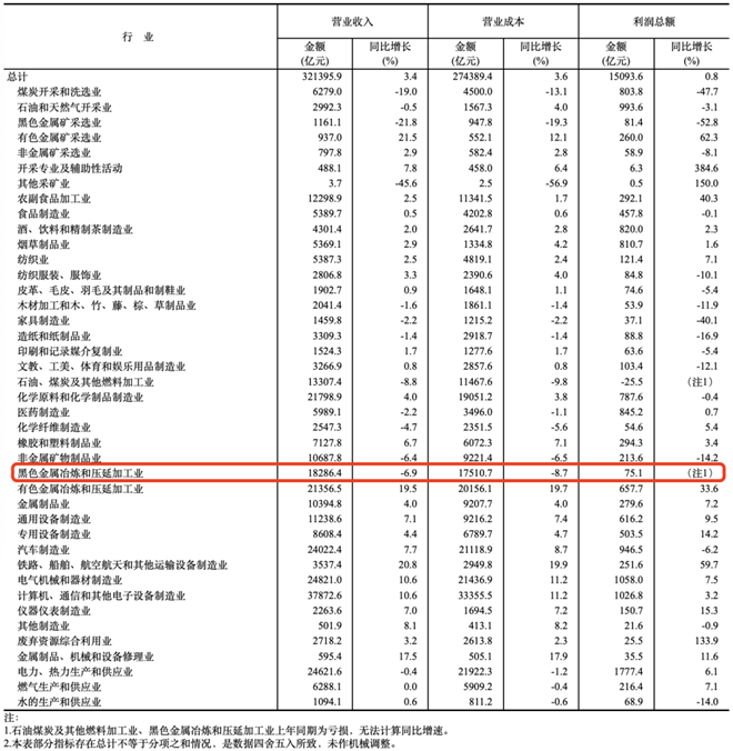 其中,黑色金屬冶煉和壓延加工業利潤總額為75.1億元,同比由虧轉盈。