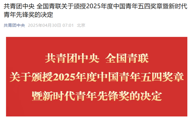 4月30日,2025年度中國青年五四獎章暨新時代青年先鋒獎評選結果揭曉。