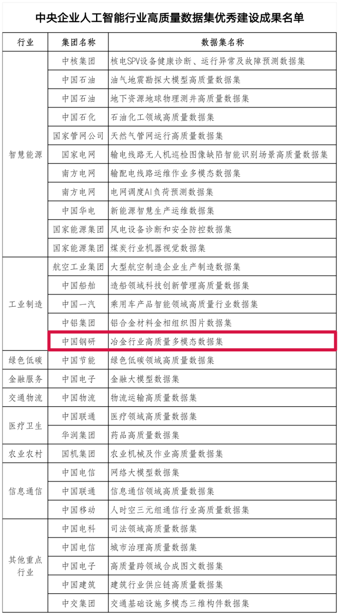 名單中,中國鋼研 ——《冶金行業高質量多模態數據集》入選。