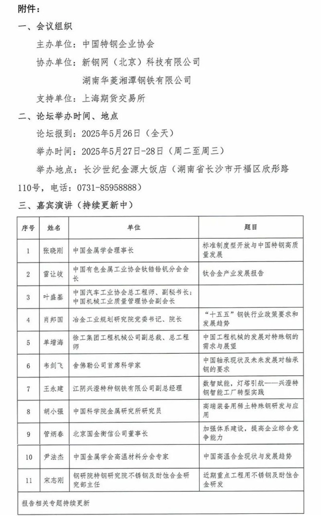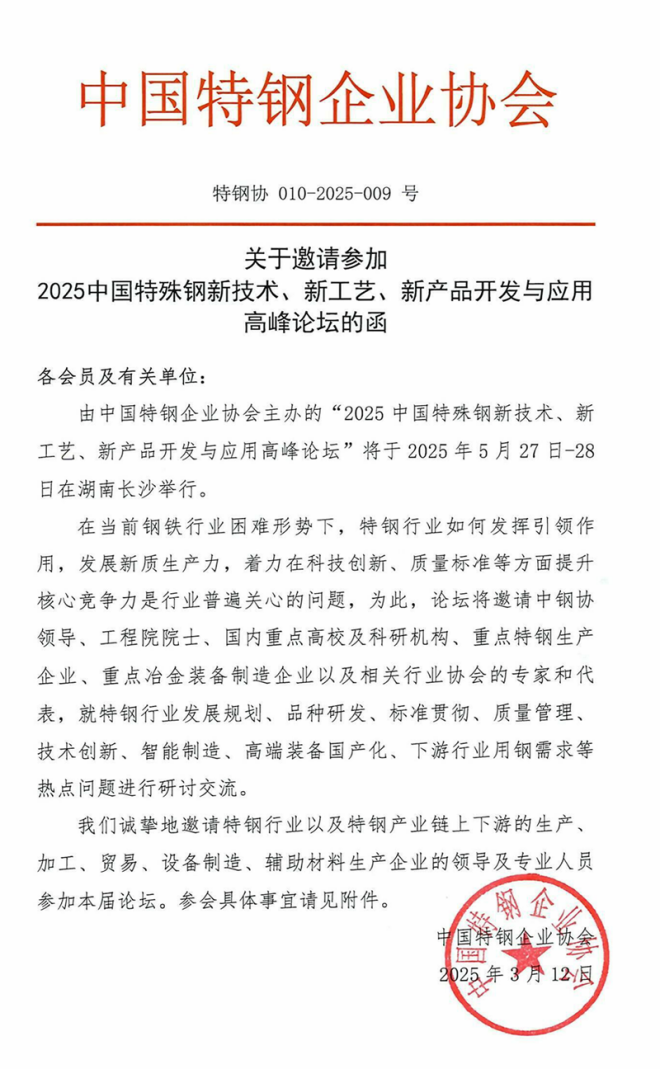 “2025中國特殊鋼新技術、新工藝、新產品開發與應用高峰論壇”邀請函