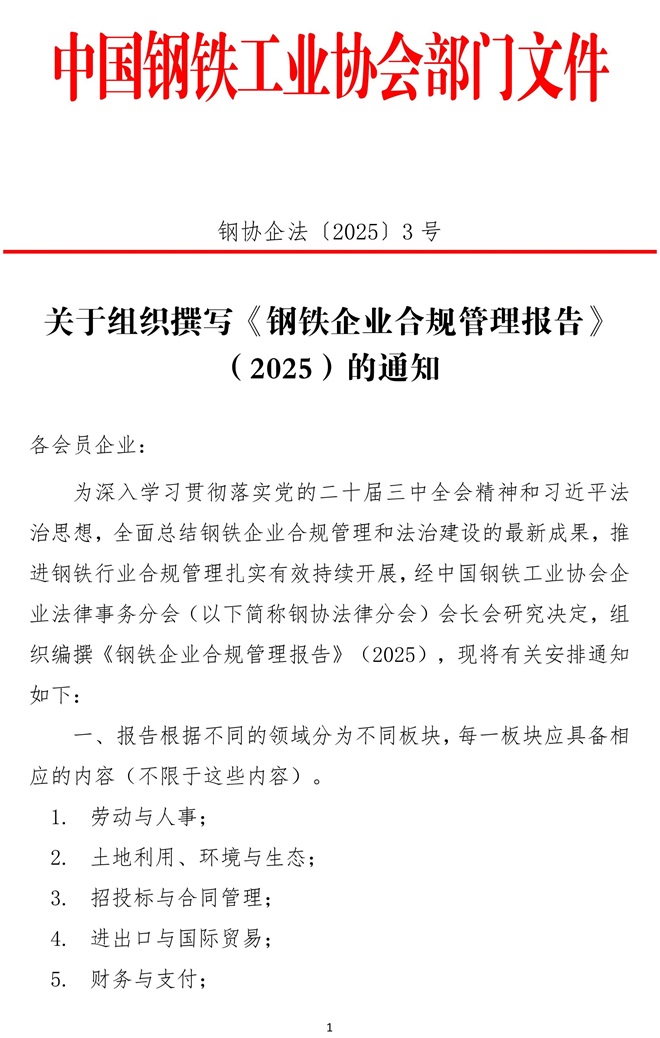 關於組織撰寫《鋼鐵企業合規管理報告》(2025)的通知
