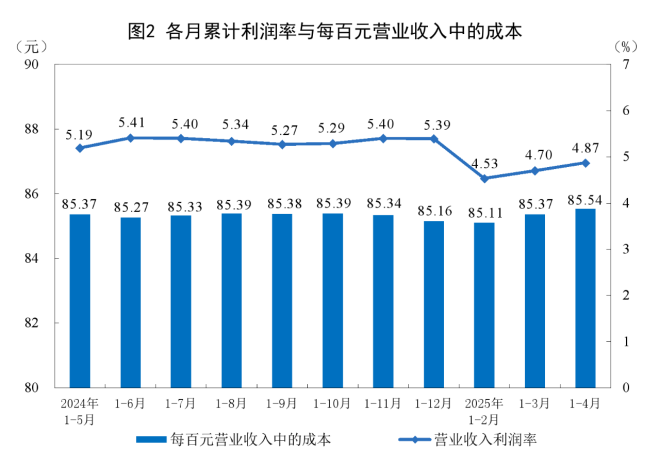 1—4月份,規模以上工業企業實現營業收入43.44萬億元,同比增長3.2%;發生營業成本37.16萬億元,增長3.4%;營業收入利潤率為4.87%,同比下降0.09個百分點。
