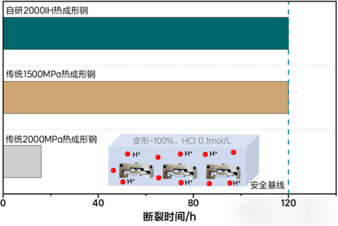 采用的四點彎曲測試驗證,在pH=1的酸性環境下,泡酸120小時的加速試驗中,2000IH展現出與傳統1500MPa熱成形鋼相當的抗氫脆性能,其抗氫脆能力更是超過傳統2000MPa熱成形鋼的5倍以上。