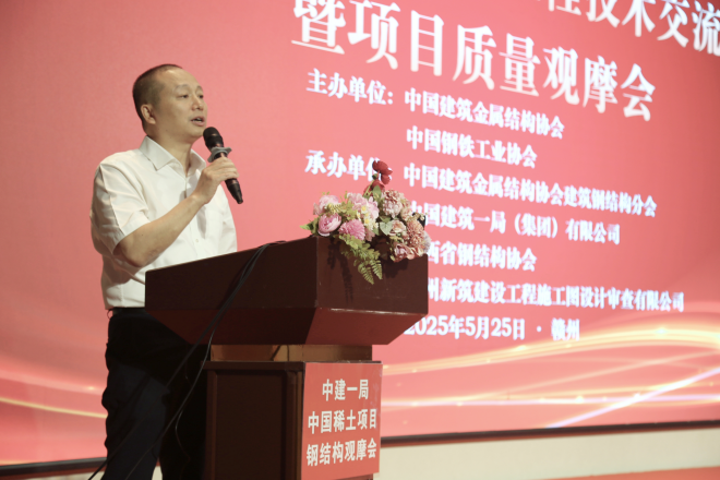 為深化鋼結構建築技術創新與產業協同,推動建築鋼結構行業高質量發展。由中國建築金屬結構協會、中國鋼鐵工業協會聯合主辦,中國建築金屬結構協會建築鋼結構分會、中國建築一局(集團)有限公司、江西省鋼結構協會、贛州新築建設工程施工圖設計審查有限公司聯合承辦的鋼結構建築示範工程建造技術交流會暨現場質量觀摩會議於2025年5月25日在江西贛州順利召開。來自行業協會、科研機構、高校及企業的專家代表、工程技術人員150餘人參加會議。
