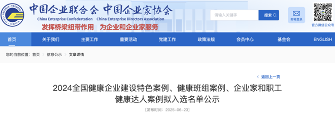 6月23日,中國企業聯合會、中國企業家協會對2024全國健康企業建設特色案例、健康班組案例、企業家和職工健康達人案例擬入選名單進行公示。