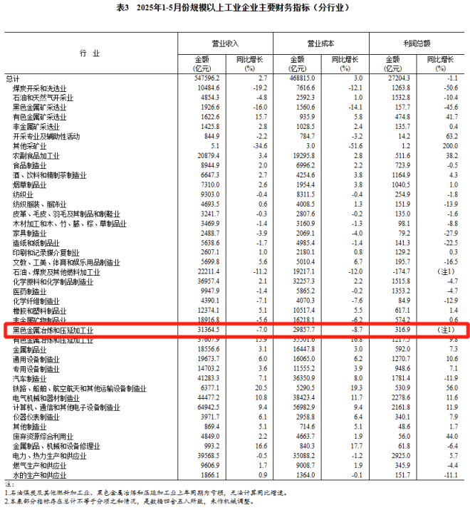 近日,從國家統計局網站獲悉,2025年1-5月份,全國規模以上工業企業實現利潤總額27204.3億元,同比下降1.1%。1-5月份,黑色金屬冶煉和壓延加工業實現利潤總額316.9億元。