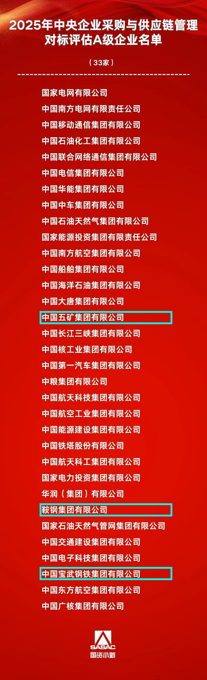 近期,國務院國資委組織完成2025年中央企業采購與供應鏈管理對標評估工作。經審定,共包含A級企業33家,其中包括3家鋼鐵相關企業,具體如下: