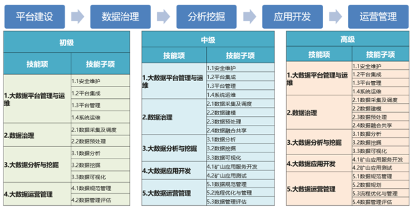 《評價規範》共劃分了4個職業方向,初級對應3個方向,中高級對應4個方向。其中,礦山大數據運維方向的職業功能(技能項)包(bao)括(kuo)大(da)數(shu)據(ju)平(ping)台(tai)管(guan)理(li)與(yu)運(yun)維(wei)和(he)大(da)數(shu)據(ju)運(yun)營(ying)管(guan)理(li),礦(kuang)山(shan)大(da)數(shu)據(ju)治(zhi)理(li)方(fang)向(xiang)的(de)職(zhi)業(ye)功(gong)能(neng)包(bao)括(kuo)數(shu)據(ju)治(zhi)理(li)和(he)大(da)數(shu)據(ju)運(yun)營(ying)管(guan)理(li),礦(kuang)山(shan)大(da)數(shu)據(ju)分(fen)析(xi)與(yu)挖(wa)掘(jue)方(fang)向(xiang)的(de)職(zhi)業(ye)功(gong)能(neng)包(bao)括(kuo)大(da)數(shu)據(ju)分(fen)析(xi)與(yu)挖(wa)掘(jue)和(he)大(da)數(shu)據(ju)運(yun)營(ying)管(guan)理(li),大(da)數(shu)據(ju)應(ying)用(yong)開(kai)發(fa)方(fang)向(xiang)的(de)職(zhi)業(ye)功(gong)能(neng)包(bao)括(kuo)大(da)數(shu)據(ju)應(ying)用(yong)開(kai)發(fa)和(he)大(da)數(shu)據(ju)運(yun)營(ying)管(guan)理(li)。
