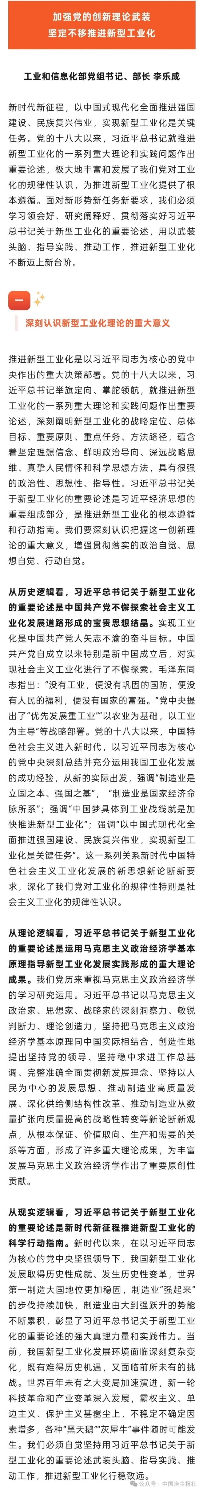 近日,工業和信息化部黨組書記、部長李樂成在《新型工業化》期刊上發表署名文章《加強黨的創新理論武裝 堅定不移推進新型工業化》。文中指出,現在我國工業生產規模已經很大,部分產品產量甚至超過了全球的60%、70%,同時隨著我國人口增長拐點的出現,鋼鐵、水泥等產業規模已經達到峰值,傳統“低價、走量”規模擴張模式已難以為繼。必須堅持以優爭先、以(yi)質(zhi)取(qu)勝(sheng),提(ti)升(sheng)製(zhi)造(zao)業(ye)供(gong)給(gei)體(ti)係(xi)質(zhi)量(liang)和(he)效(xiao)率(lv),以(yi)高(gao)質(zhi)量(liang)的(de)供(gong)給(gei)創(chuang)造(zao)和(he)引(yin)領(ling)需(xu)求(qiu),不(bu)斷(duan)拓(tuo)展(zhan)發(fa)展(zhan)新(xin)空(kong)間(jian)。要(yao)順(shun)應(ying)高(gao)端(duan)化(hua)智(zhi)能(neng)化(hua)綠(lv)色(se)化(hua)發(fa)展(zhan)趨(qu)勢(shi),通(tong)過(guo)科(ke)技(ji)引(yin)領(ling)、數字賦能、質量築基、文化鑄魂、品(pin)牌(pai)增(zeng)值(zhi),推(tui)動(dong)製(zhi)造(zao)業(ye)由(you)規(gui)模(mo)擴(kuo)張(zhang)重(zhong)點(dian)轉(zhuan)向(xiang)價(jia)值(zhi)創(chuang)造(zao),提(ti)高(gao)增(zeng)加(jia)值(zhi)率(lv),向(xiang)微(wei)笑(xiao)曲(qu)線(xian)兩(liang)端(duan)延(yan)伸(shen),向(xiang)價(jia)值(zhi)鏈(lian)上(shang)遊(you)攀(pan)升(sheng),不(bu)斷(duan)提(ti)高(gao)質(zhi)量(liang)和(he)效(xiao)益(yi)。