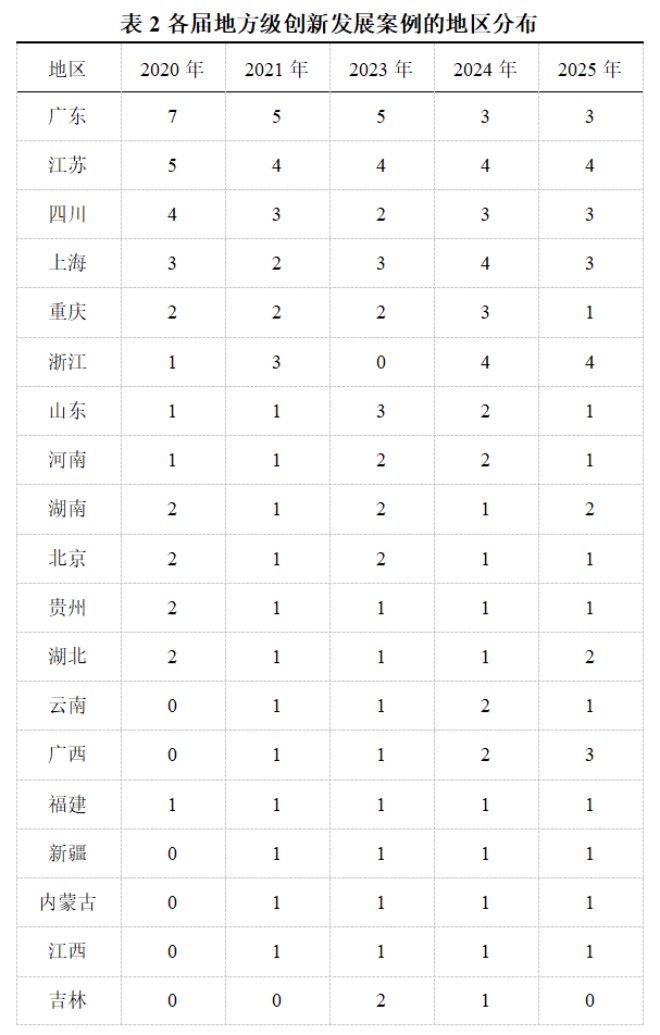 各屆的地方級案例數量見表2所示,廣東省案例總量排名第一,為23個,但各屆的案例數量整體呈下降趨勢;江蘇省案例總量排名第二,為21個,各屆案例數量保持穩定;四川省、上海市的案例總量並列第三,各屆數量均較穩定;浙江省案例總量排名第五,近兩年入選案例數量增加。
