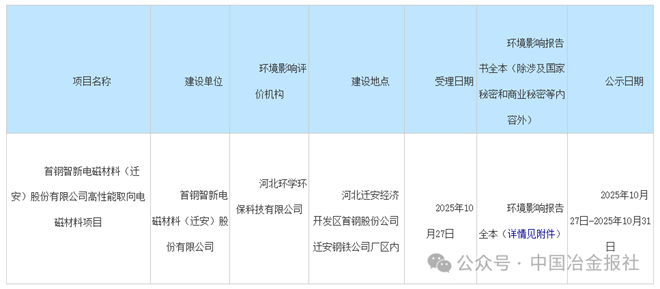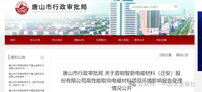 10月27日,唐山市行政審批局網站發布關於首鋼智新電磁材料(遷安)股份有限公司高性能取向電磁材料項目環境影響報告受理情況公開。