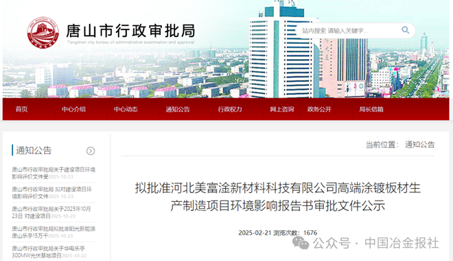 唐山市行政審批局於2025年2月21日(ri)發(fa)布(bu)的(de)公(gong)示(shi)信(xin)息(xi),河(he)北(bei)美(mei)富(fu)淦(gan)新(xin)材(cai)料(liao)科(ke)技(ji)有(you)限(xian)公(gong)司(si)高(gao)端(duan)塗(tu)鍍(du)板(ban)材(cai)生(sheng)產(chan)製(zhi)造(zao)項(xiang)目(mu)已(yi)進(jin)入(ru)環(huan)評(ping)擬(ni)批(pi)準(zhun)階(jie)段(duan)。該(gai)項(xiang)目(mu)位(wei)於(yu)河(he)北(bei)樂(le)亭(ting)經(jing)濟(ji)開(kai)發(fa)區(qu),具(ju)體(ti)位(wei)置(zhi)東(dong)至(zhi)樂(le)亭(ting)新(xin)區(qu)建(jian)設(she)投(tou)資(zi)有(you)限(xian)公(gong)司(si)、南至黃海路、西至營口道、北至渤海路。項目總投資34.5億元,其中環保投資達13360萬元,占比3.87%。項目建成後,年可生產高端冷軋板材、鍍錫卷、鍍鉻卷、退火卷、鍍鋅卷共130萬噸。