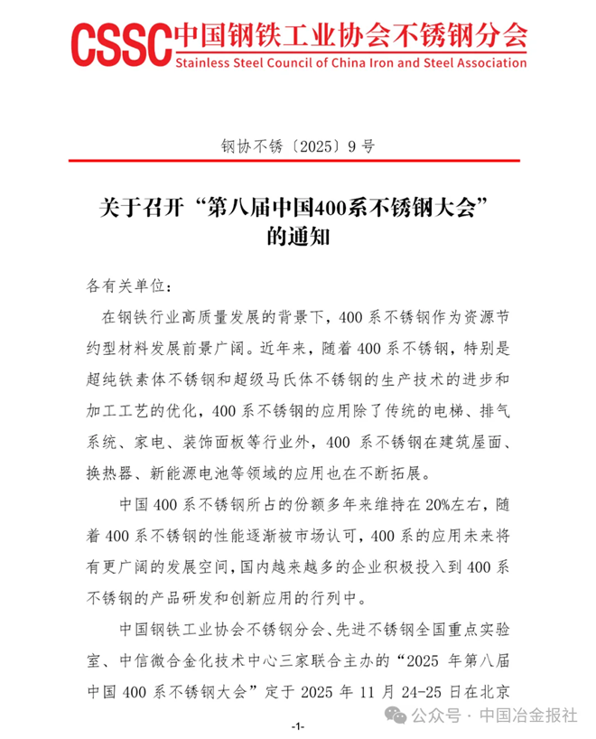 2025年第八屆中國400係不鏽鋼大會會議通知