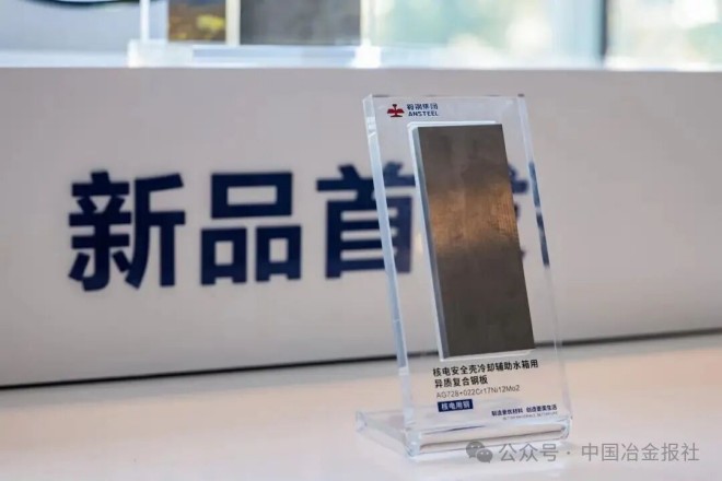 核電安全殼冷卻輔助水箱用異質複合鋼——AG728+022Cr17Ni12Mo2:鞍鋼集團聯合設計單位曆時2年研製,率先應用於3代非能動壓水堆核電機組。與奧氏體不鏽鋼相比,抗拉強度大幅提升,綜合成本顯著下降。攻克組坯焊接、超寬板幅等難題,成功生產寬度3700mm超寬規格產品,通過嚴苛焊接與應用評價。