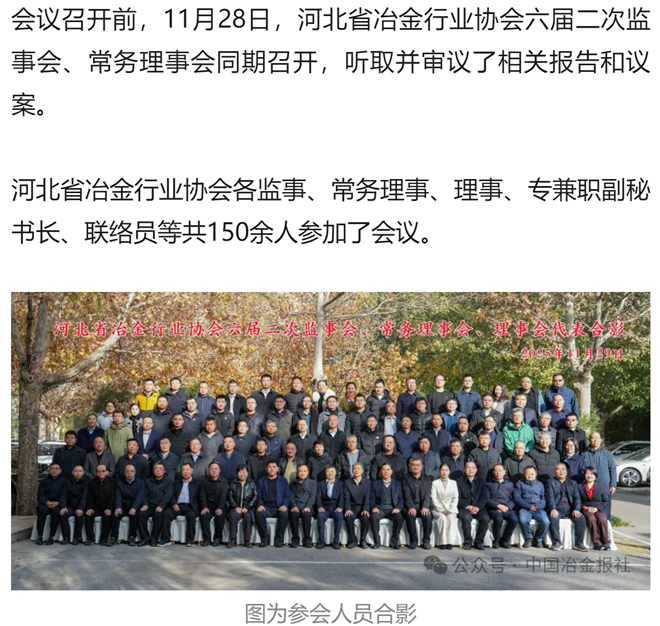 11月28日-29日,河北省冶金行業協會六屆二次理事會在河北石家莊召開。會議號召,站在“十四五”邁向“十五五”的曆史交彙點上,河北鋼鐵企業既要係統總結“十四五”發展經驗,又要前瞻性提早介入“十五五”規劃,將綠色基因、數字血脈、創新靈魂注入產業變革,書寫從“支柱”到“引領”的時代答卷,為譜寫中國式現代化建設河北篇章繼續作出鋼鐵新貢獻。