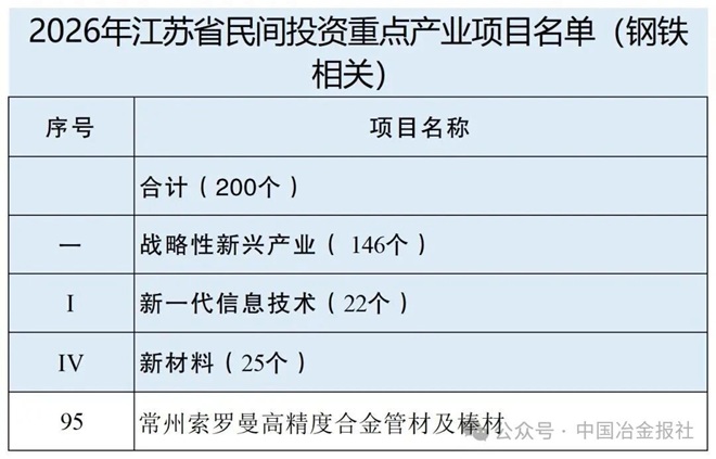 近日,江蘇省發展改革委發布2026年江蘇省重大項目名單、2026年江蘇省民間投資重點產業項目名單。其中,鋼鐵項目整理如下: