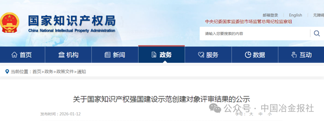 1月12日,國家知識產權局官網公布了關於國家知識產權強國建設示範創建對象評審結果。