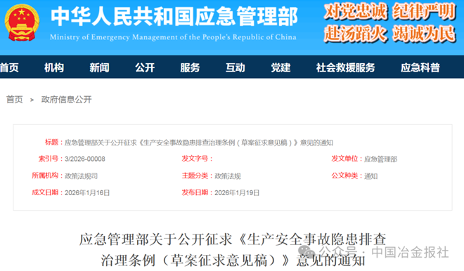 1月19日,應急管理部發布通知,就生產安全事故隱患排查治理條例征求意見。