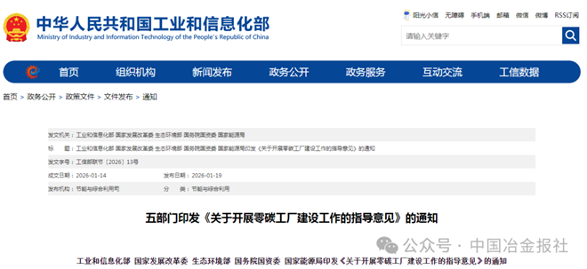 1月19日,工業和信息化部、國家發展改革委、生態環境部、國務院國資委、國家能源局等五部門聯合印發《關於開展零碳工廠建設工作的指導意見》(以下簡稱《指導意見》),深挖工業和信息化領域節能降碳潛力,帶動重點行業領域減碳增效和綠色低碳轉型,培育發展新質生產力。
