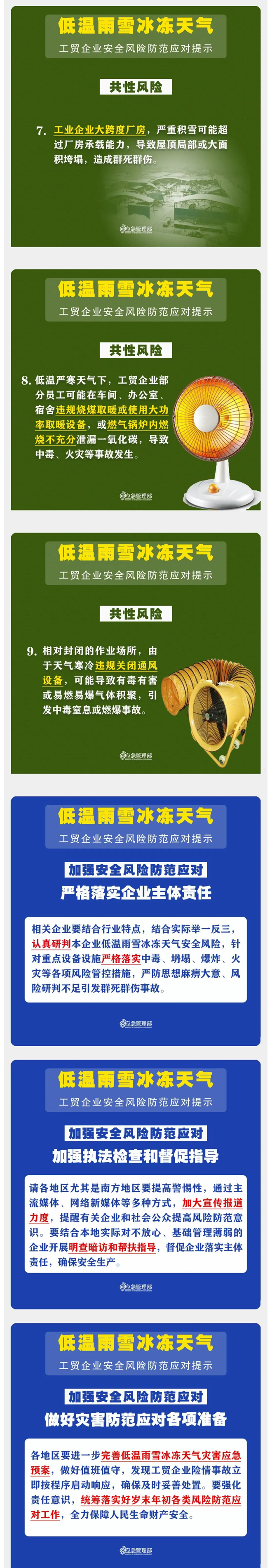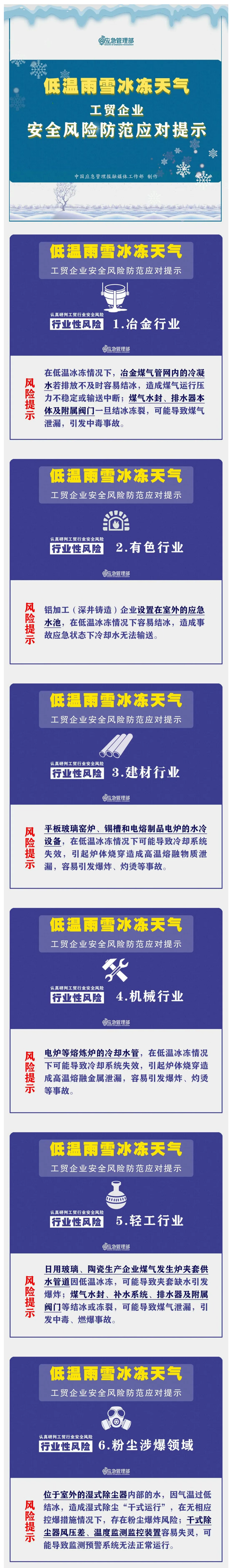 低溫雨雪冰凍天氣持續時間長、影響範圍廣,防範不當極易引發事故。為進一步做好工貿企業安全風險防範應對,提示如下: