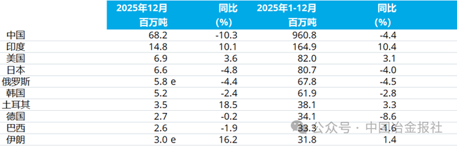 2025年12月全球70個納入世界鋼鐵協會統計國家/地區的粗鋼產量為1.396億噸,同比下降3.7%。