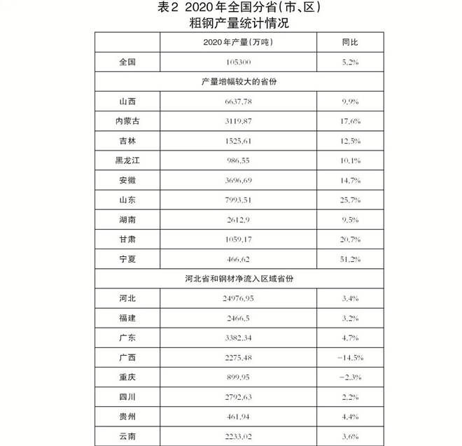 從2020年全國分省(直轄市、自治區)粗鋼產量統計來看,大量存在鋼材淨流出區域的省(直轄市、自治區)粗鋼產量同比大幅增長的現象,反映出國內鋼材市場在生產和消費上的不匹配。而這些省(直轄市、自治區)應該成為控製粗鋼產量的重點限製區域。(見表2)