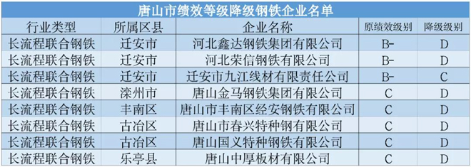 3月11日,唐山市生態環境局發布通知,對部分企業績效等級進行了降級處理。9家鋼鐵企業被降級,具體如下表: