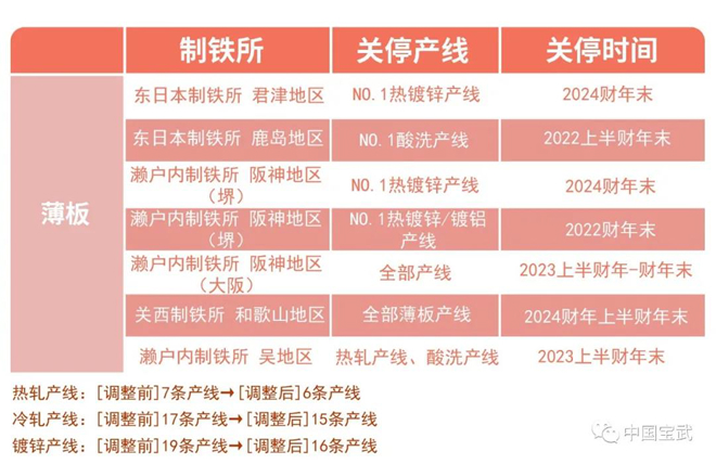 關停部分東日本製鐵所君津地區熱鍍鋅產線和鹿島地區的酸洗產線,將生產集中到君津地區的其他生產線和名古屋製鐵所等生產線。