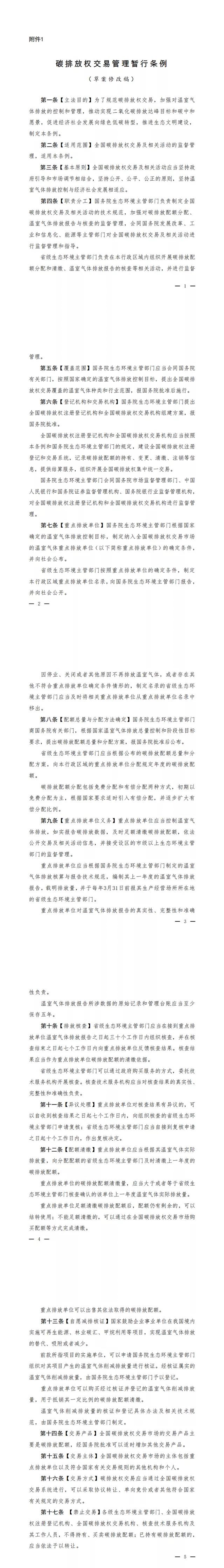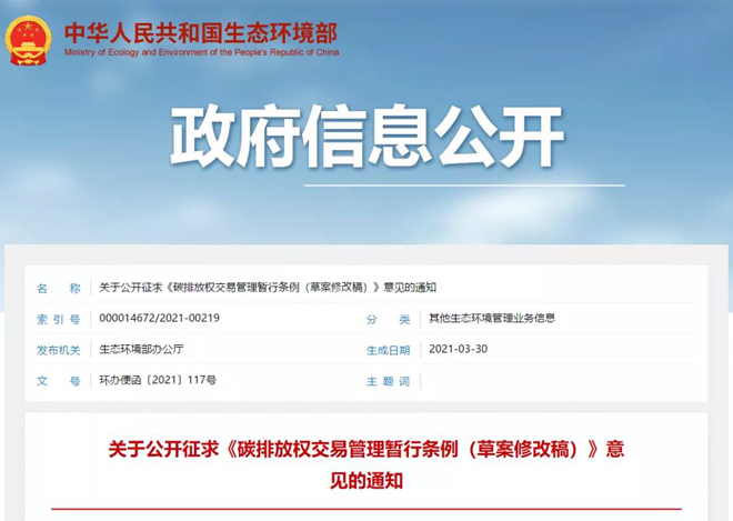 3月30日,生態環境部發布關於公開征求《碳排放權交易管理暫行條例(修改意見稿)》(以下簡稱“《修改意見稿》”)的通知,提出建設全國碳排放權注冊登記和交易係統,記錄碳排放配額的持有、變更、清繳、注zhu銷xiao等deng信xin息xi,提ti供gong結jie算suan服fu務wu,組zu織zhi開kai展zhan全quan國guo碳tan排pai放fang權quan集ji中zhong統tong一yi交jiao易yi。被bei納na入ru全quan國guo碳tan排pai放fang權quan交jiao易yi市shi場chang的de重zhong點dian排pai放fang單dan位wei,不bu再zai參can與yu地di方fang碳tan排pai放fang權quan交jiao易yi試shi點dian市shi場chang。