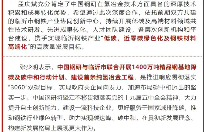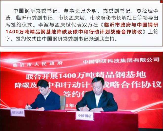 中國鋼研與臨沂市人民政府簽署1400萬噸精品鋼基地降碳及碳中和行動計劃戰略合作協議