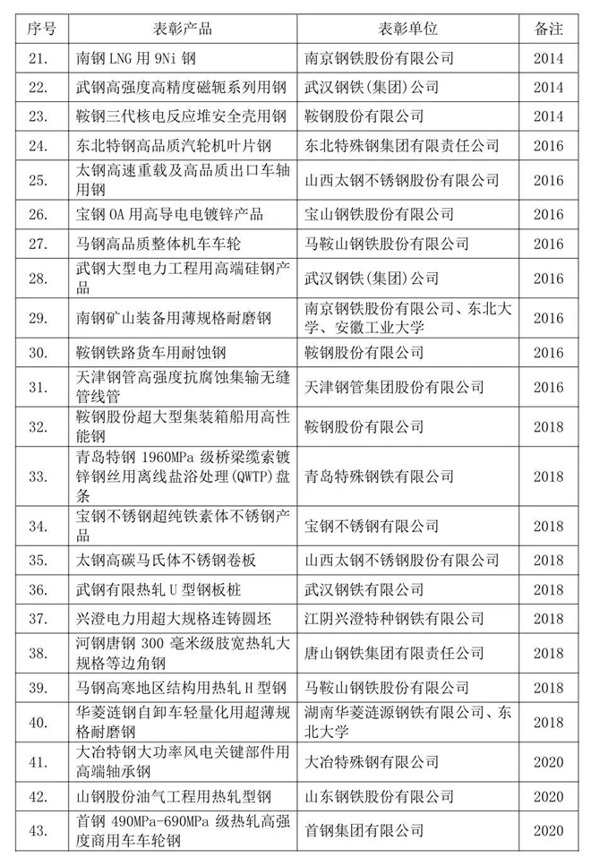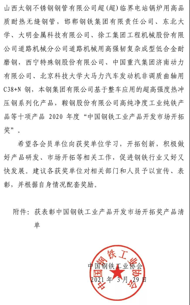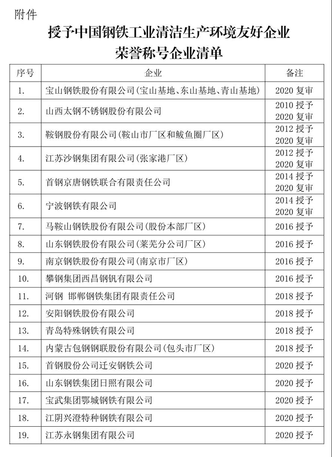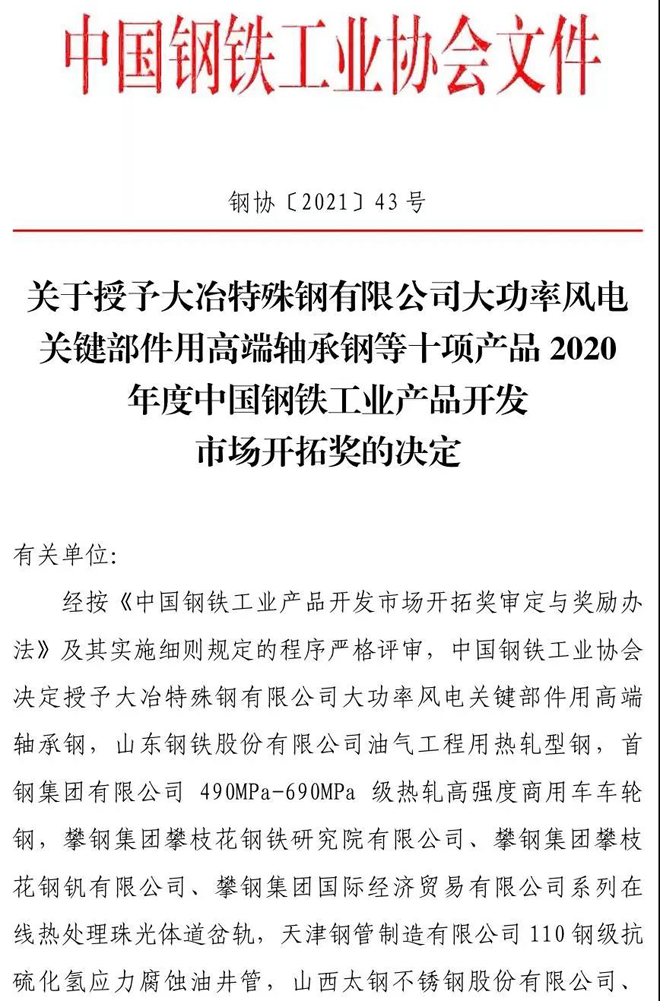 近日,中國鋼鐵工業協會發布《關於授予首鋼股份公司遷安鋼鐵公司等五家企業2020年度中國鋼鐵工業清潔生產環境友好企業榮譽稱號的決定》和《關於授予大冶特殊鋼有限公司大功率風電關鍵部件用高端軸承鋼等十項產品2020年度中國鋼鐵工業產品開發市場開拓獎的決定》。