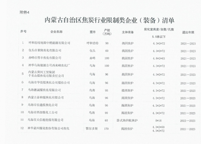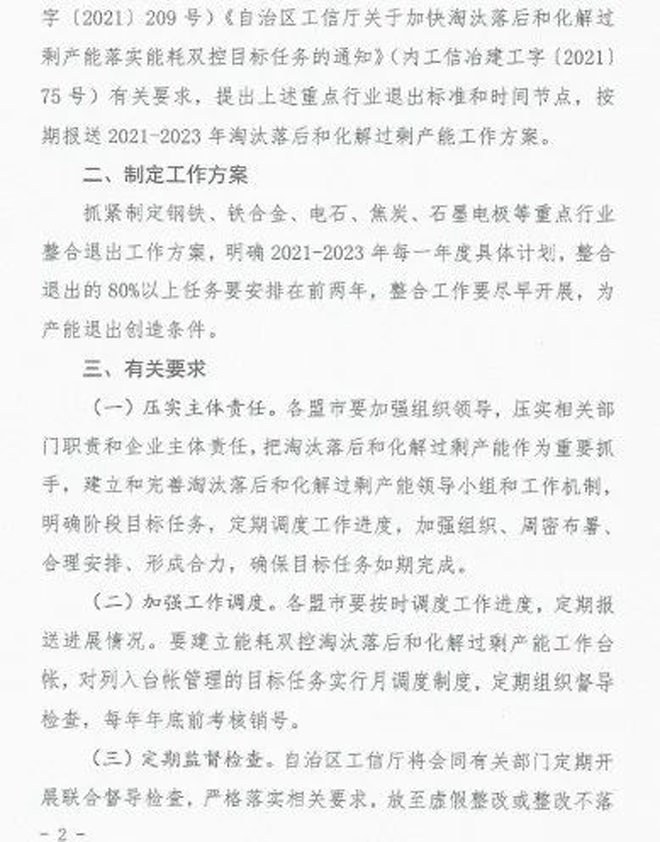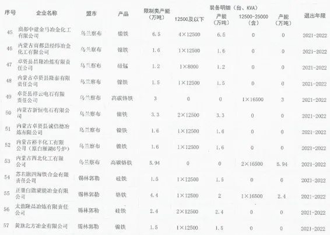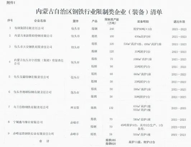 日前,內蒙古自治區工業和信息化廳印發《關於印發淘汰落後化解過剩產能計劃的通知》(以下簡稱《通知》),《通知》要求各盟市抓緊製定鐵合金、鋼鐵行業退出方案,明確2021~2023每一年度具體計劃,並要求整合退出的80%以上任務要安排在2021~2022年,整合工作要盡早開展,為產能退出創造條件。