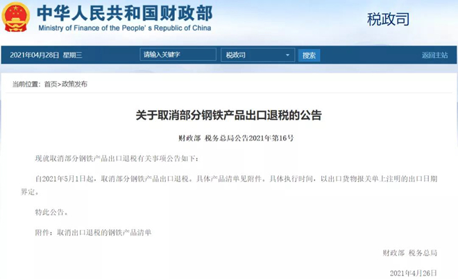 4月28日,財政部網站發布《關於取消部分鋼鐵產品出口退稅的公告》,自2021年5月1日起,取消部分鋼鐵產品出口退稅。其中,涉及146個鋼鐵產品的稅則號。