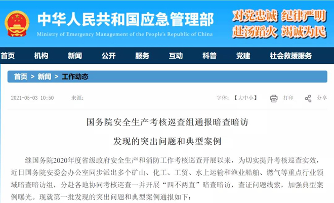 繼國務院2020年度省級政府安全生產和消防工作考核巡查開展以來,為切實提升考核巡查實效,近日國務院安委會辦公室同步派出多個礦山、化工、工貿、水上運輸和漁業船舶、燃氣等重點行業領域暗查暗訪組,分赴各地協同考核巡查一並開展“四不兩直”暗查暗訪,查證問題線索,加強典型案例曝光。5月3日,應急管理部網站發布第一批在暗查暗訪中發現的突出問題和典型案例通報。
