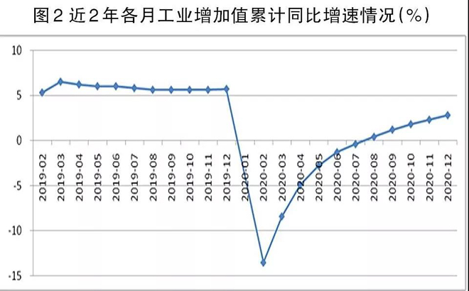 從工業增加值累計同比角度看,2019年各月累計增速的高點出現在3月份,為累計同比增長6.5%,此後連續多月回落,8月~11月份均為5.6%,較3月份回落了0.9個百分點。2020年2月~7月份,工業增加值累計同比為負增長,但降幅逐月收窄,7月份增速已收縮至-0.4%;8月份起,工業增加值累計同比實現正增長,且增幅逐月擴大,12月份累計同比提高至2.8%,但依然較2019年下降了2.9個百分點(見圖2)。這表明,整個工業經濟雖然在下半年呈現出良好的發展態勢,但由於2020年第一季度工業增加值降幅過大,導致2020年工業增加值增速較2019年有一定差距。