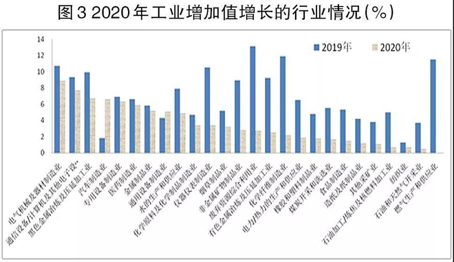 2020年有26個大類工業行業增加值實現正增長(其中燃氣生產和供應業增速為0),而2019年41個大類工業行業增加值全部為正增長,據此可初步判定2020年工業增加值增長結構要弱於2019年。